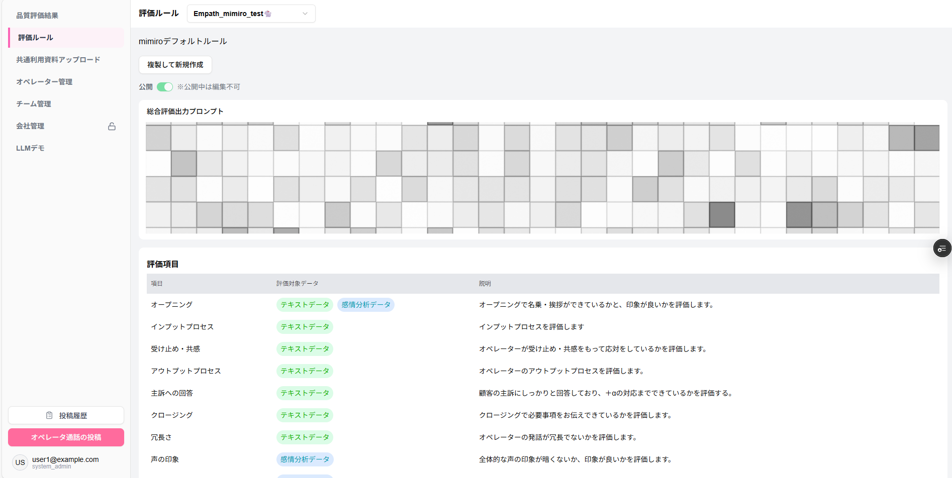mimiroは、評価ルールや基準を自社や委託先の運営方針に合わせて自由にカスタマイズすることが可能です。「オープニングの言葉遣いを重視する」「共感表現を徹底する」「商品説明のわかりやすさを重視する」など、業界や企業ごとの優先ポイントに応じて評価項目を設定可能です。これにより「評価者によって基準が異なる」という属人化を排除し、公平で一貫性のある評価を実現します。