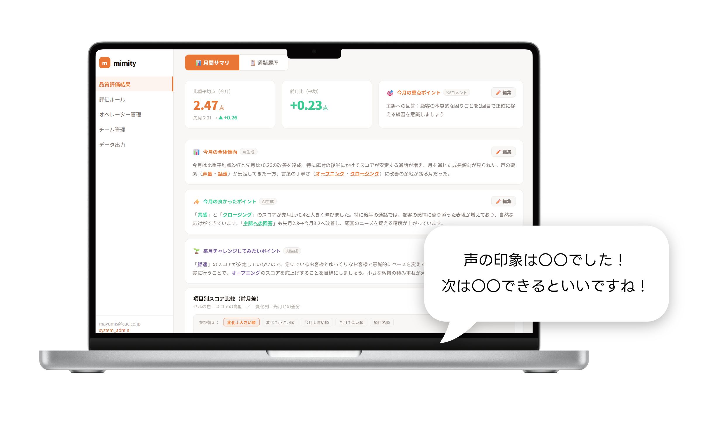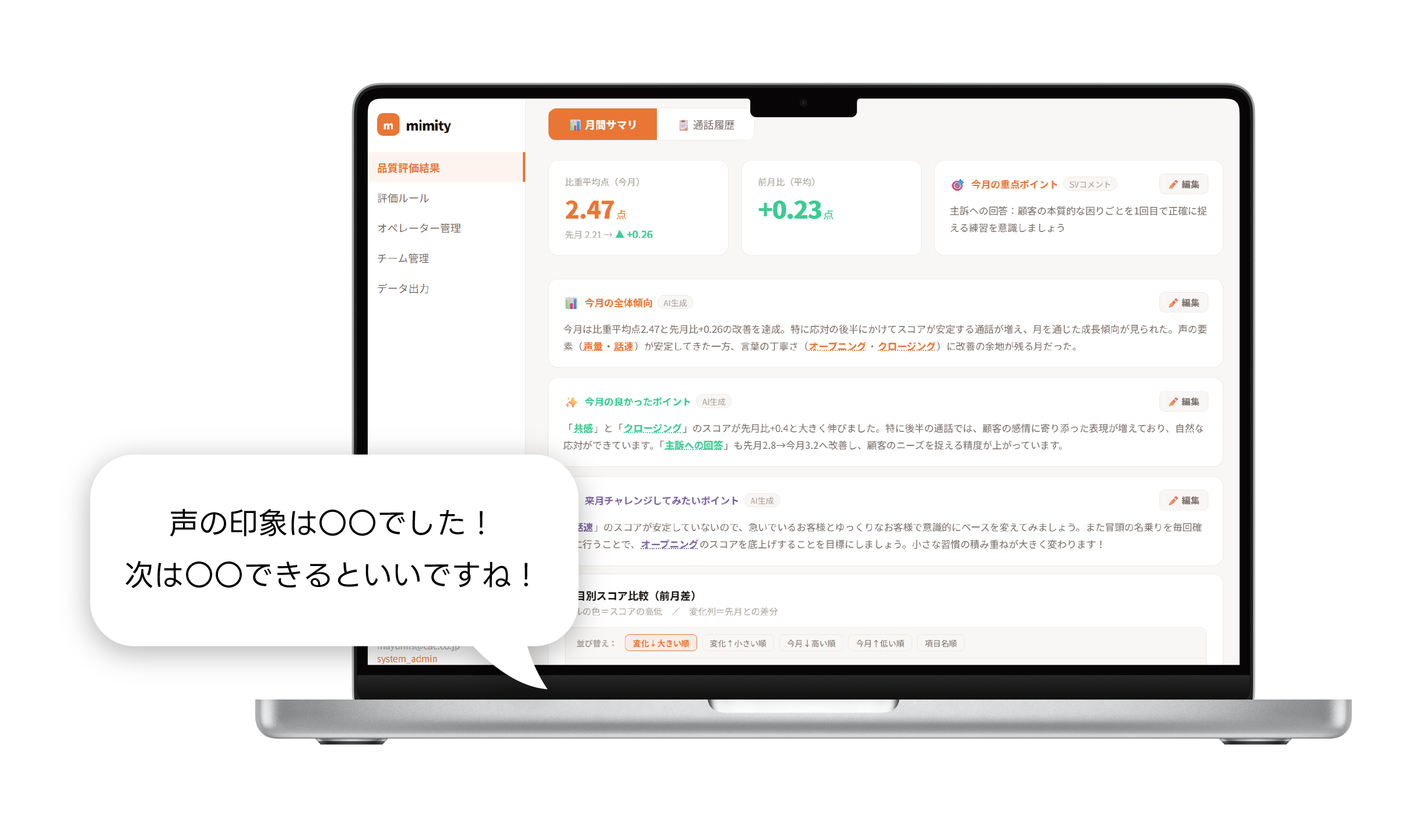 mimityは、会話内容と声の印象の両方を分析し、人間が評価するのに近い粒度で「良い応対」「改善が必要な応対」を自動でスコアリング