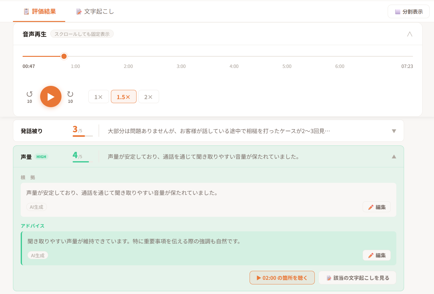 通話ごとに自動生成される点数と改善ポイントを、オペレーター個人単位で確認できる機能です。 単なる「良かった/悪かった」の評価ではなく、どの場面で強みが出ていたのか、どこを改善すべきなのかを具体的に提示します。評価の根拠となる発話内容や声の印象の分析結果とともに、AIが改善アドバイスを出すことで、オペレーターは自身の応対を客観的に振り返ることができます。 SVはmimityが整理したフィードバックを起点に、気になる通話や重要な場面に耳を傾けることで、効率的かつ的確な指導が可能になります。