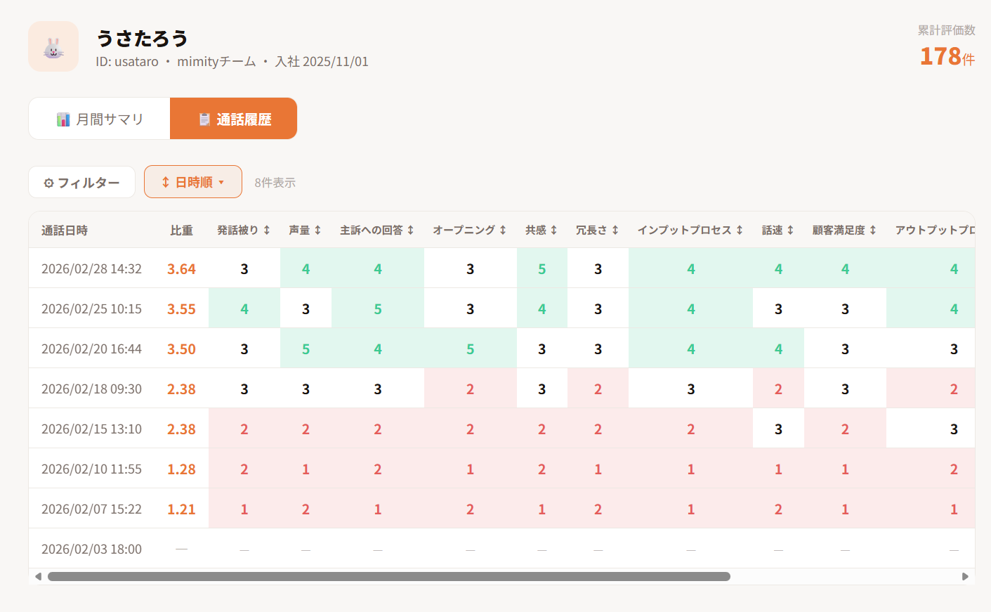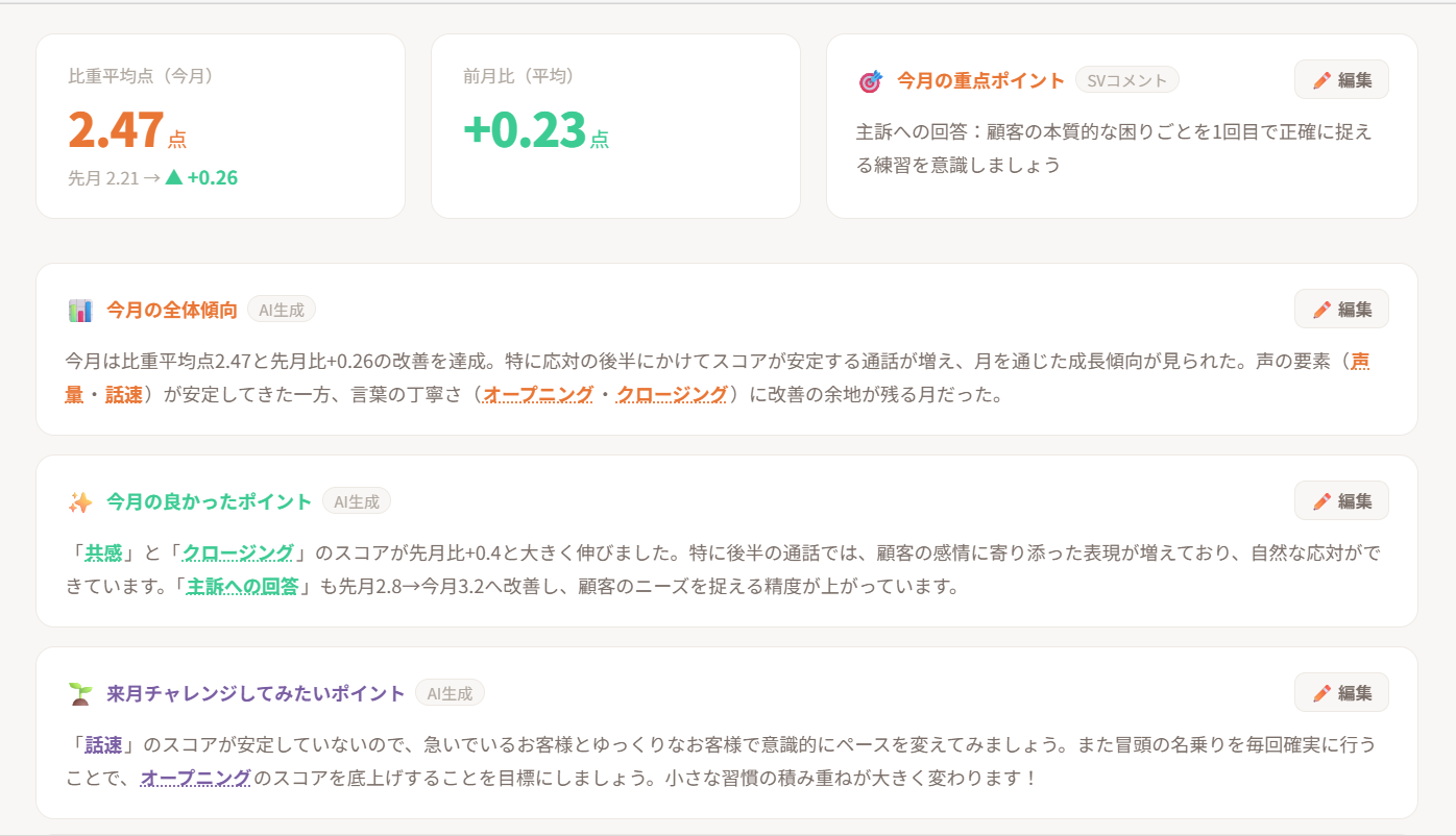 通話ごとに点数と改善ポイントを確認。良い通話・悪い通話の傾向を把握。